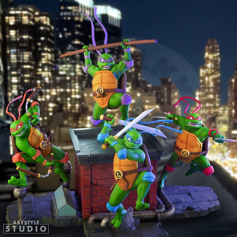 Cowabunga! 4 poloskořepinoví hrdinové a nejobávanější newyorský bojový tým zažívají svůj velký návrat prostřednictvím série SFC od studia ABYstyle! Ačkoli byla každá želva navržena tak, aby se dala sbírat samostatně, figurka odhalí svou skutečnou velkolepost, jakmile budou čtyři bratři vystaveni společně, a vytvoří dynamickou scénu, která vzdává hold původní animaci 80. a 90. let. Toto dioráma dodá energii jak nostalgickým, tak i těm nejnáročnějším fanouškům díky pečlivé péči, která byla věnována designu postav, ozbrojených a v akčním režimu na střechách New Yorku, připravených bránit město před Trhačovými zločiny.
